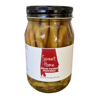Imagine a jar filled with vibrant, crisp-tender spears of pickled asparagus. The bright green of our fresh asparagus is punctuated by slices of fiery jalapeno peppers, adding a pop of color and a kick of heat. Garlic is scattered throughout, their pungent aroma mingling with the fresh scent of dill fronds that float amongst the vegetables. The pickling brine, a clear liquid slightly tinged with the hues of the ingredients, surrounds the asparagus, promising a tangy, salty, and savory experience. This isn't just pickled asparagus; it's a jar of bold, flavorful excitement.