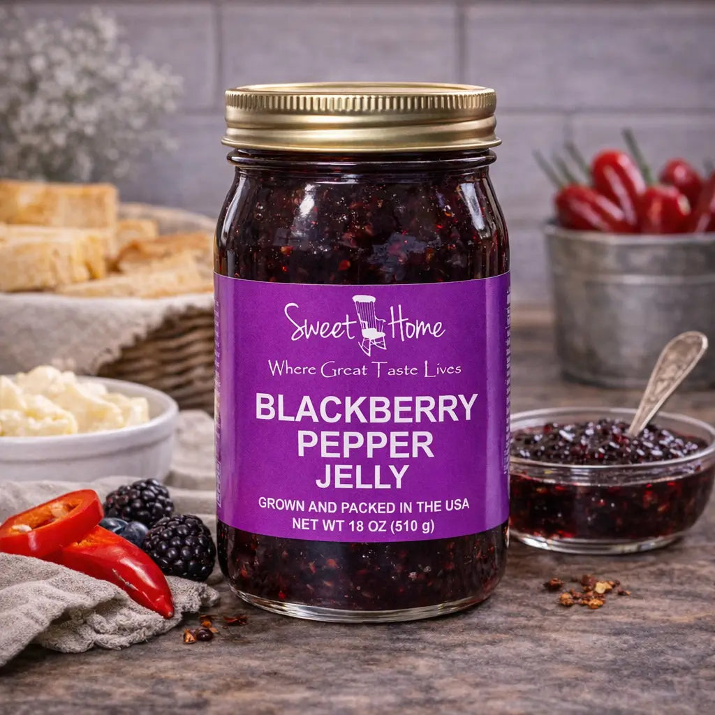 Our Sweet Home Blackberry Pepper Jelly mixes the deep, rich flavor of blackberries with the bright kick of red bell pepper, cayenne, and red pepper flakes. Spread it on toast, add it to charcuterie boards, or whisk it into vinaigrettes for a sweet-spicy punch.