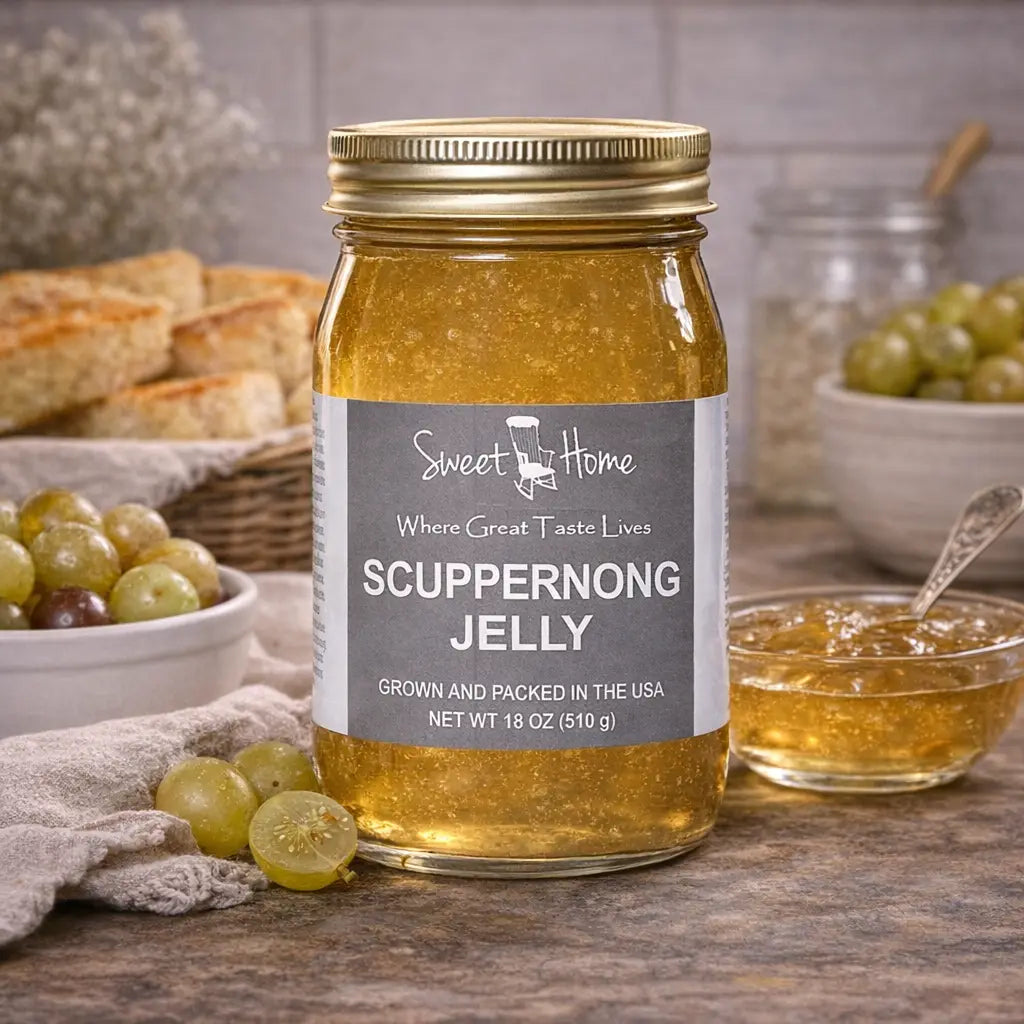 Scuppernong grapes — a prized variety of muscadine — are known for their honeyed flavor and sunlit aroma. Our Sweet Home Scuppernong Jelly captures that heritage in every spoonful. Smooth, mellow, and beautifully fragrant, this jelly is perfect for biscuits, pastries, and cheese boards.