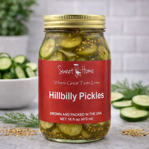 Our Sweet Home Hillbilly Dill Pickles are a classic Southern staple — crisp cucumbers pickled in a tangy, savory brine with just the right balance of vinegar and spices. With no added heat, these pickles deliver pure, old-school dill flavor and satisfying crunch in every bite. They’re perfect for snacking, stacking on sandwiches, or serving alongside your favorite comfort foods.
