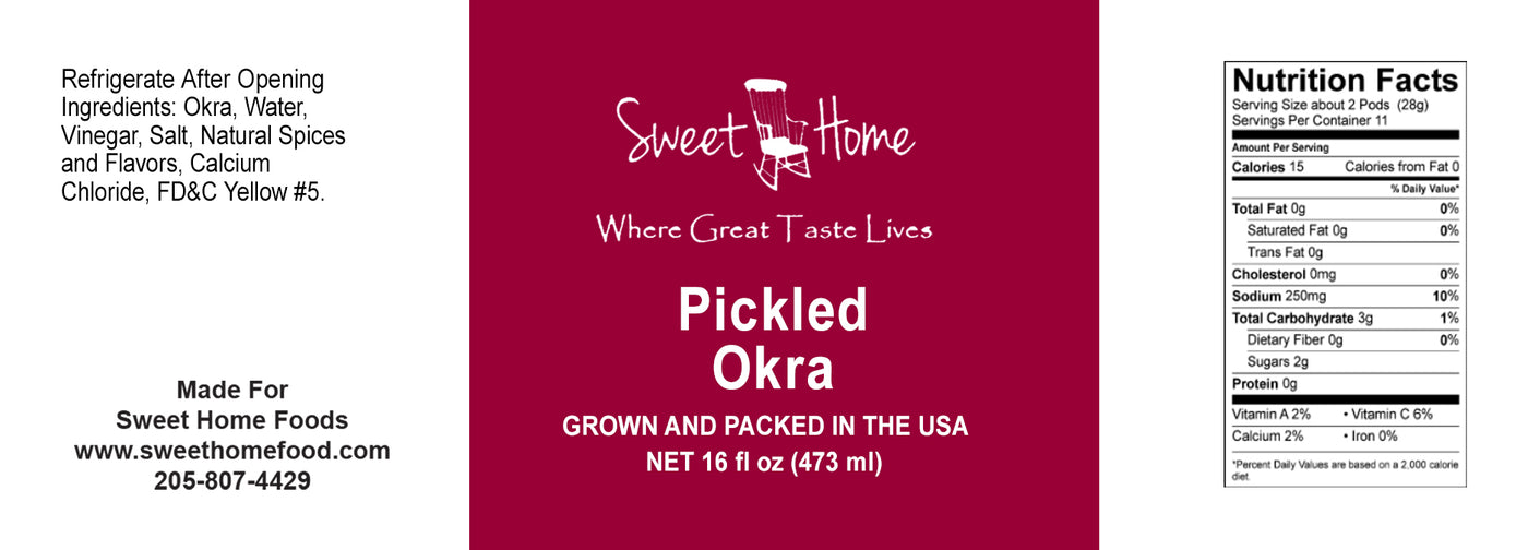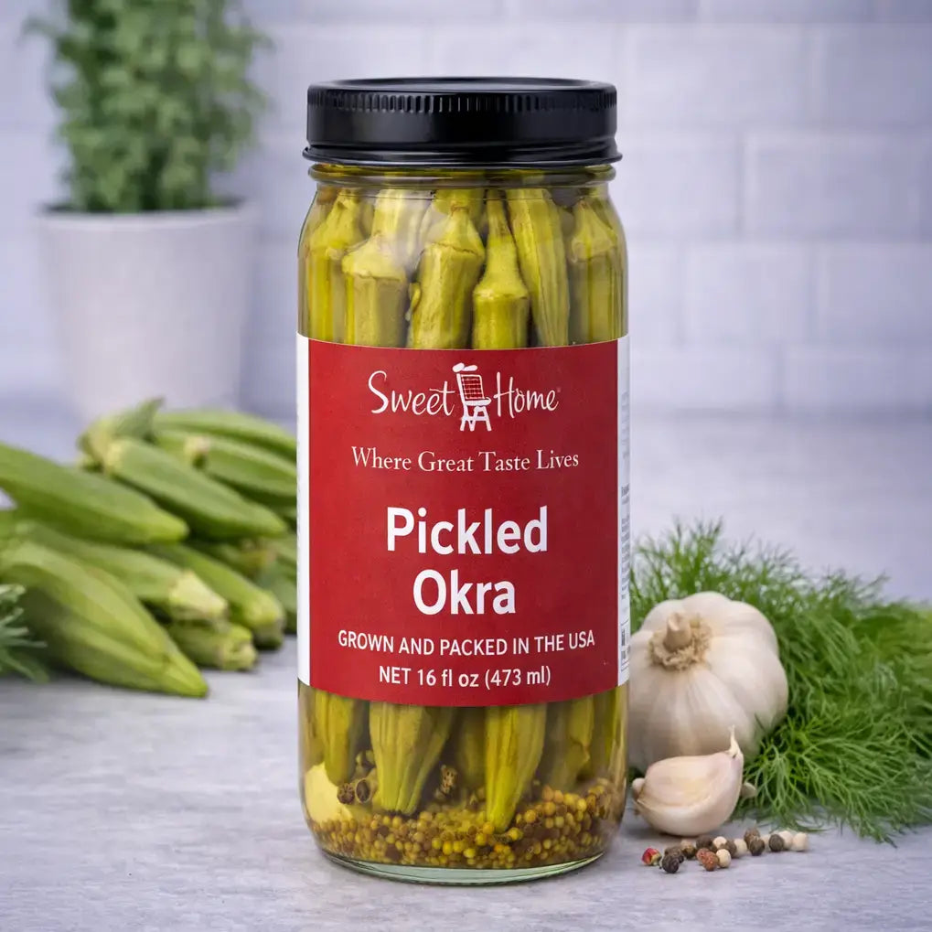 Enjoy the crisp, bold taste of our Sweet Home Pickled Okra — whole okra pods pickled in a savory dill-accented brine that delivers refreshing tang and satisfying crunch. This Southern favorite is perfect straight from the jar, added to salads, served on snack trays, or paired with your favorite cheeses and BBQ plates. Fresh, flavorful, and delightfully pickle-forward — just the way you like it.