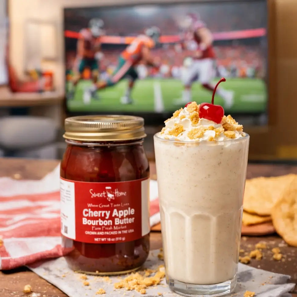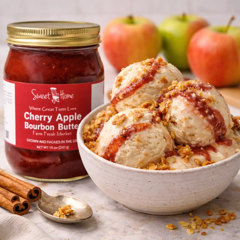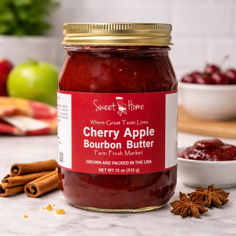 Our handcrafted Cherry Apple Bourbon Butter is slow-cooked to achieve a rich, velvety texture and deep, spiced flavor. Made from ripe apples, sweet cherry purée, warm spices, and a hint of bourbon flavor, this spread delivers comforting Southern character in every spoonful. The bourbon is used only for flavor during cooking, and the alcohol cooks off, leaving a smooth, indulgent taste without alcohol.
